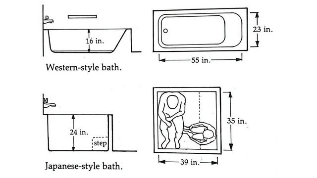 The traditional Japanese tub is usually estimated to be 24 inches deep enough to cover the shoulders of a seated person. As for the width, one person requires about 32-36 inches. That water covers your entire body. As for the Western-style bathtub, it’s usually long and narrow enough for the user to lie down.