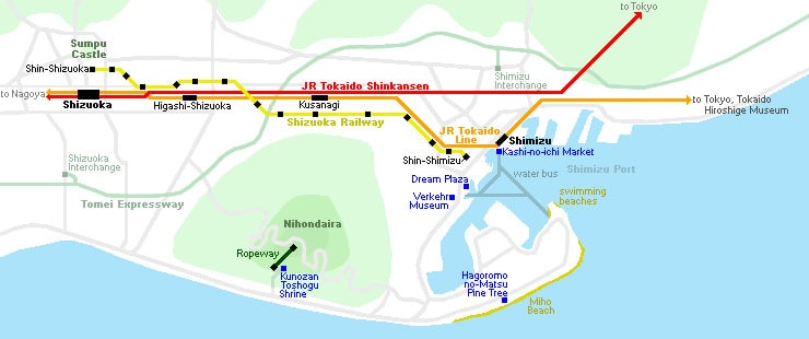 The JR Tokaido Shinkansen connects Tokyo and Shizuoka; a journey on the Hikari train is about 60 minutes, or 90 minutes if taking the Kodama. The Nozomi does not make a stop at Shizuoka Station. An ordinary one-way fare is 5940 yen for an unreserved seat, with around 6500 yen for a reserved seat; if you have the Japan Rail Pass, you can ride with either the Hikari or Kodama trains.