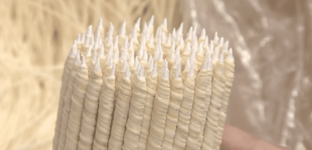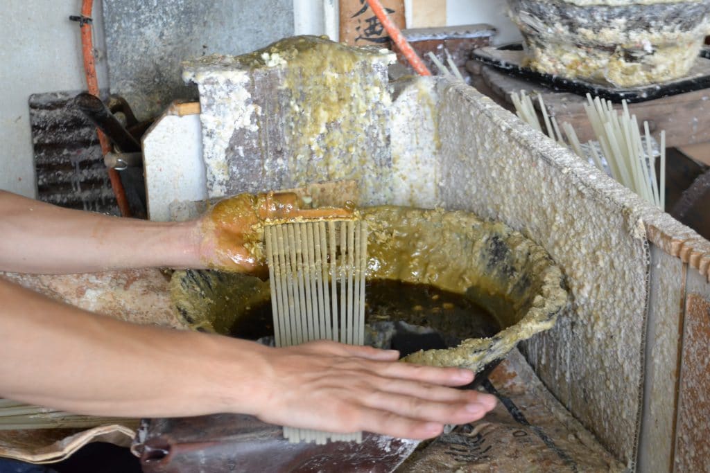 Next, in a process called Shitagake, the wicks are coated with wax by hand. By now, the temperature of the wax is 46 degrees Celsius, which allows the candle maker to handle it by hand.
