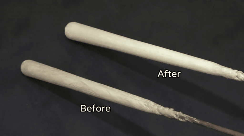 The candle maker scrapes the ends to expose the wicks. The wooden sticks that hold the wax together are also removed. Lastly, the candles are cut to their desired lengths.