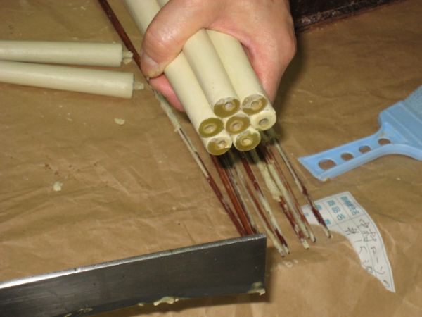 The Japanese candlewick is thicker and more rigid than the Western one. The candle maker uses a long piece of Japanese paper, or washi, and wraps it around a stick.